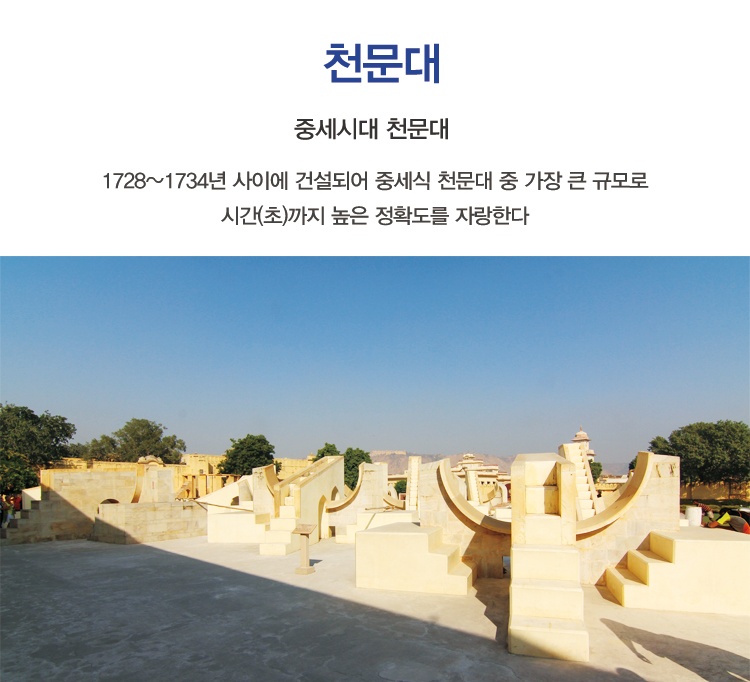- 자이푸르의 창시자이자 라지푸트(Rajput)의 왕인 사와이 자이 싱 2세(Sawai Jai Singh II)가 제작한 19개의 천문 기구로 1734년에 완성