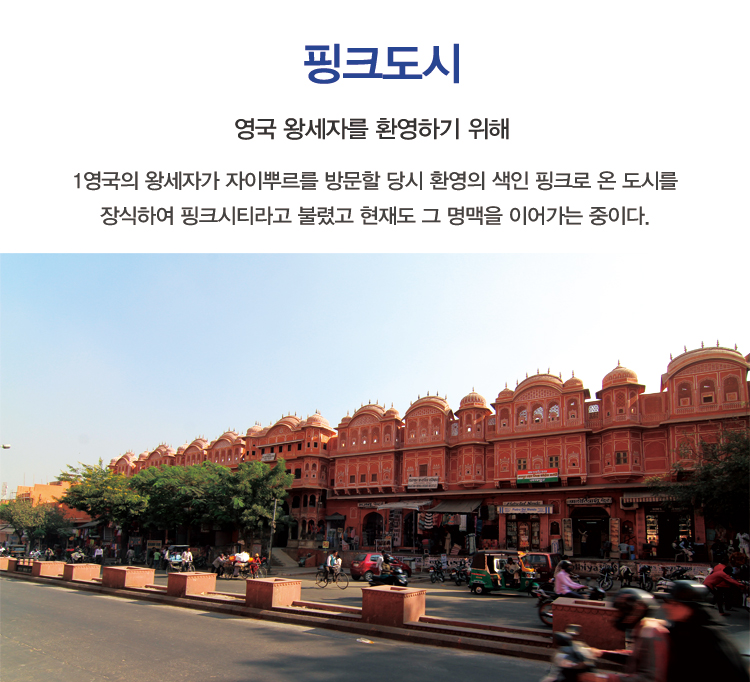 - 영국의 왕세자가 자이풀를 방문할 당시 환영의 색인 핑크로 온 도시를 장식하여 핑크시티라 불렸고 현재도 명맥을 이어감