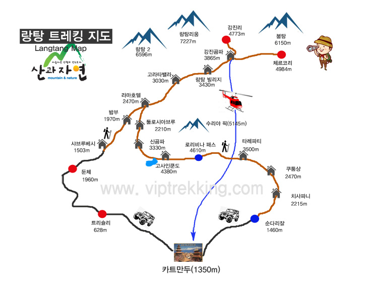 코스 : 인천-카트만두-둔체-샤브루베시-라마호텔-랑탕밸리(3,500m)-걍진곰파(3,850m)-체르고리(4,984m)-툴로샤브루-신곰파(3,250m)-코사인쿤드(4,380m)-라우리나야크 패스(4,610m)-치사파니(2,245m)-순다리잘(1,460m)-카트만두-인천